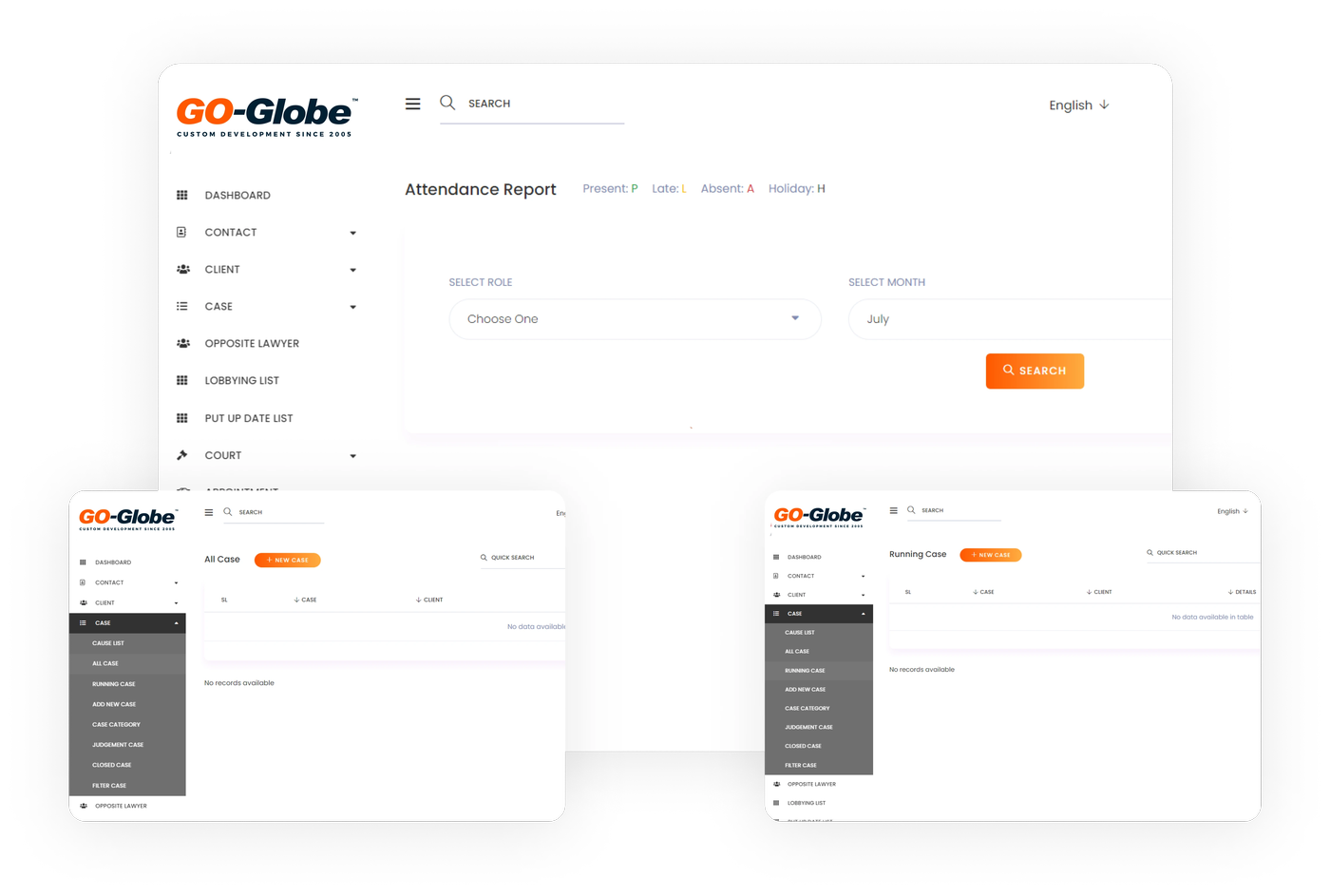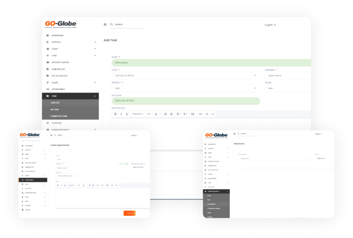 Additionally, the Advocate Management System, with GO-Globe’s integration, includes tools for court information, task management, and human resources, offering a comprehensive approach to office management. Payroll and leave management features ensure all aspects of employee administration are handled precisely. Event scheduling and holiday configuration further enhance the system’s ability to manage a legal office's complexities. GO-Globe's services guarantee that these tools are implemented in a way that suits your business needs perfectly.