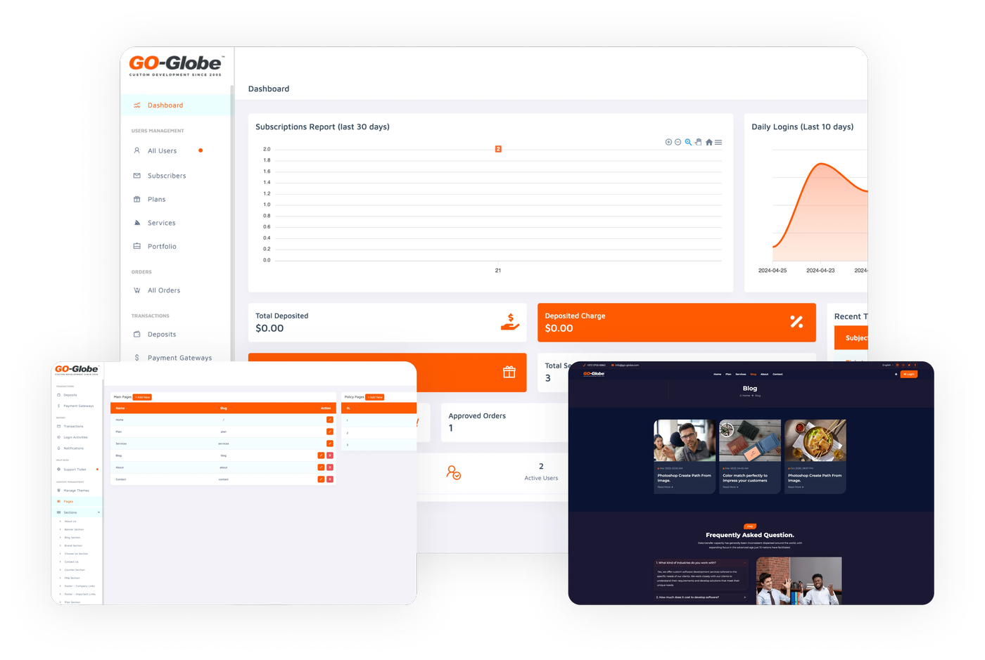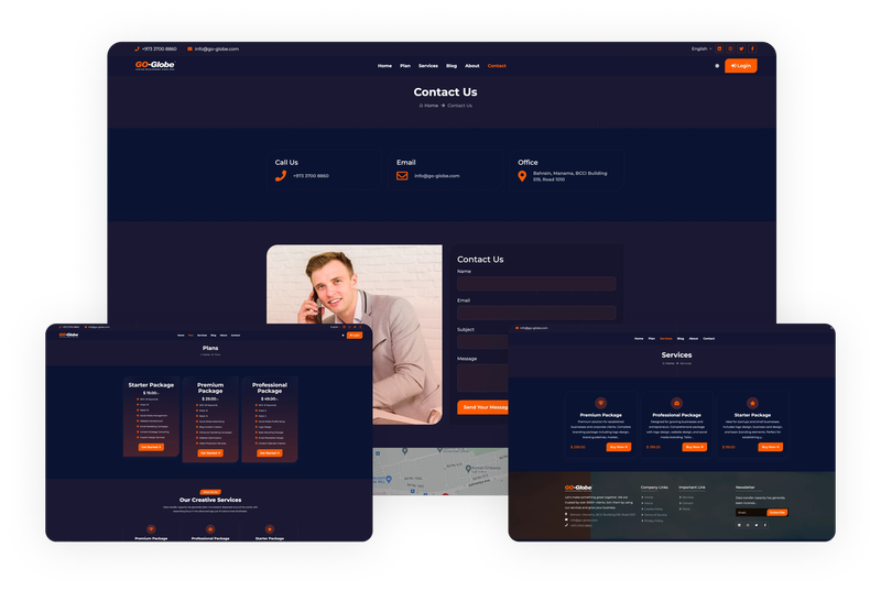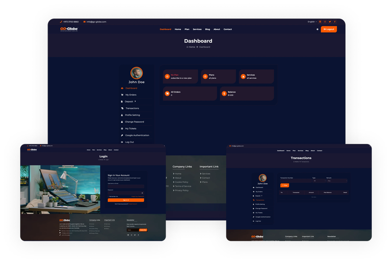 The user dashboard integrates options such as an order list, deposit management, transaction record, support ticketing, subscription model, and service administration, providing users with complete command over their operations. The admin dashboard supports effective administration with tools for viewing user and subscriber lists, coordinating plans and services, displaying a portfolio of achievements, processing orders, overseeing deposits and transactions, and supervising notifications. This integration ensures streamlined operations and enhanced user satisfaction, making our business company website templates a valuable asset for your business.