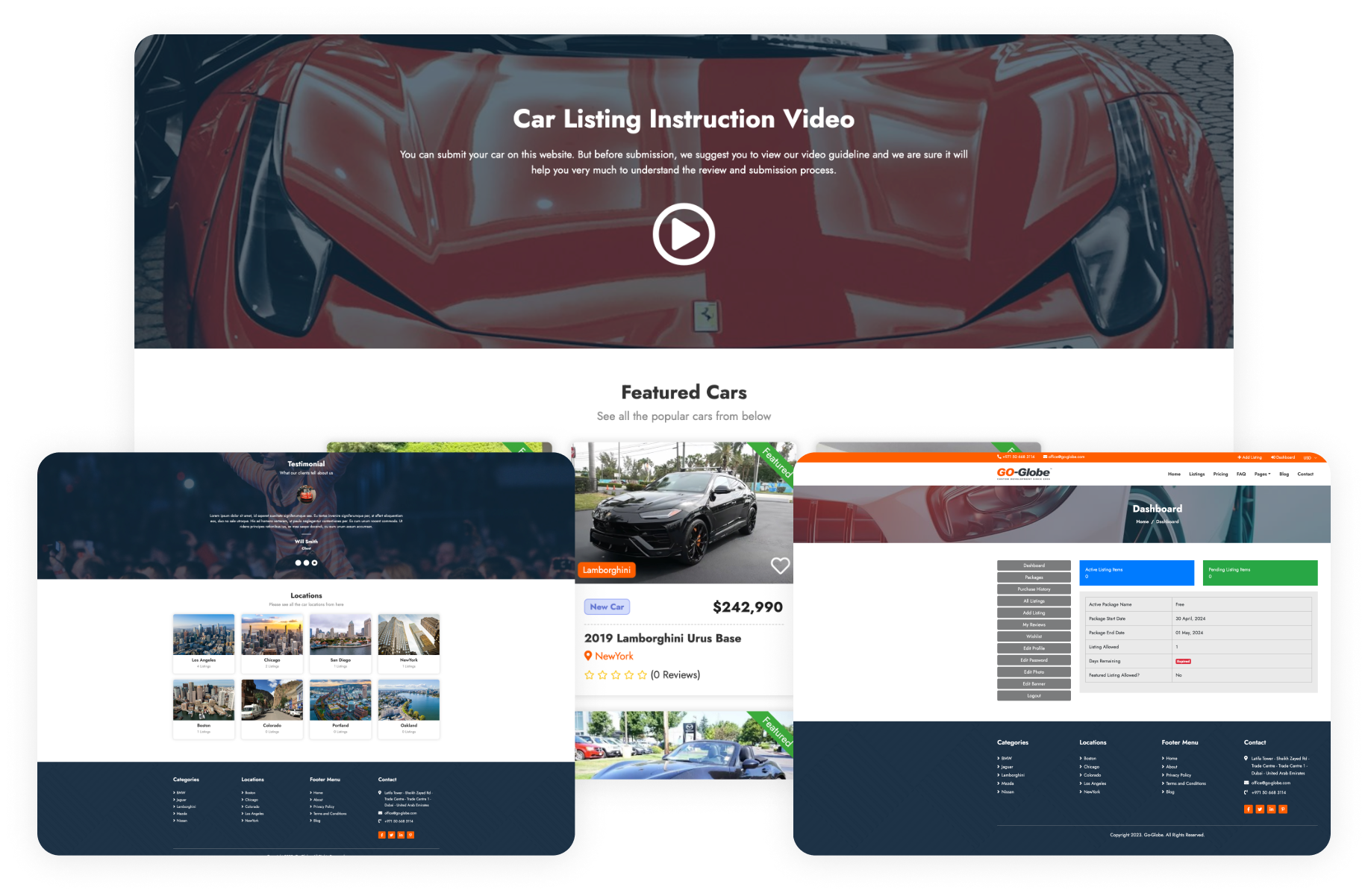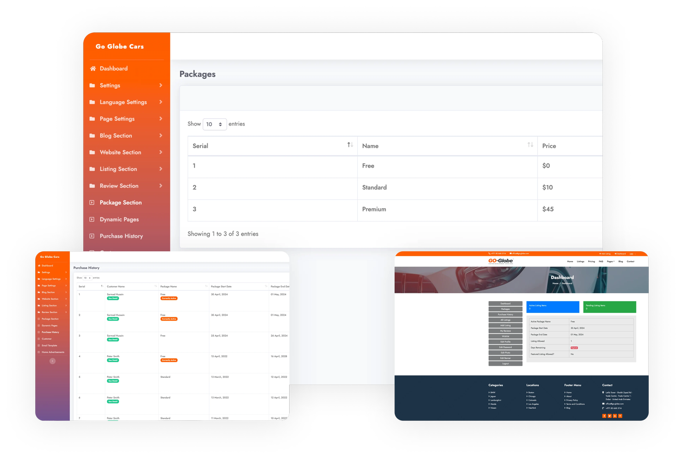 The car listing portal provides comprehensive functionalities for users and administrators. The front end comprises multiple sections such as Home, Currency, About, Pricing, Blog, Post Detail, Comment, Category Detail, Search, FAQ, Dynamic Page, Contact, Store Contact Form, Terms and Conditions, Privacy Policy, Listing Detail, Send Message, and Report Listing, all necessary for supervising a car management software.