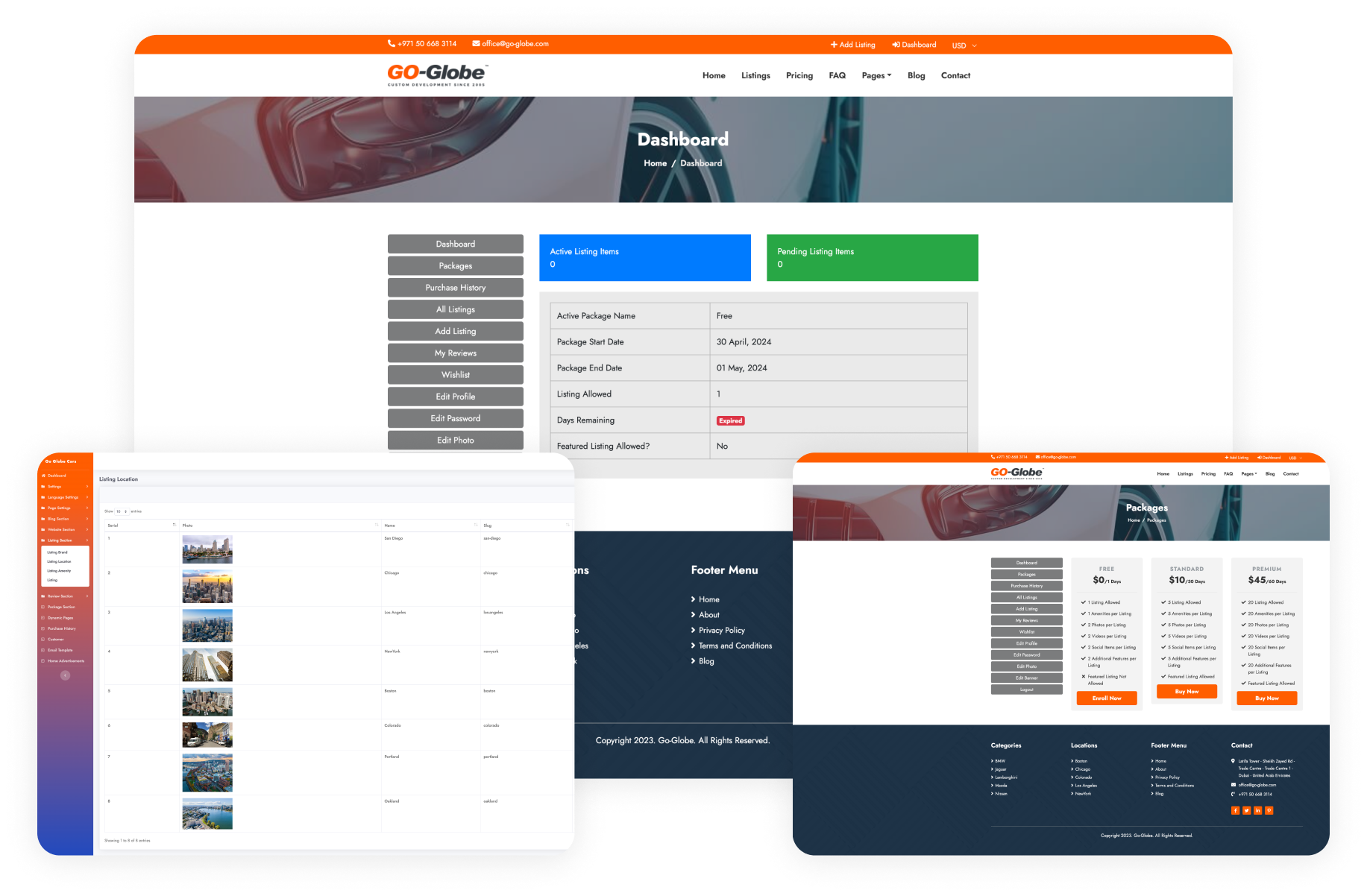The customer profile features a Dashboard, Package options, Free Enrollment, Buy Package, Payment, Purchase History, Update Profile, View Listing, My Reviews, and wishlist.