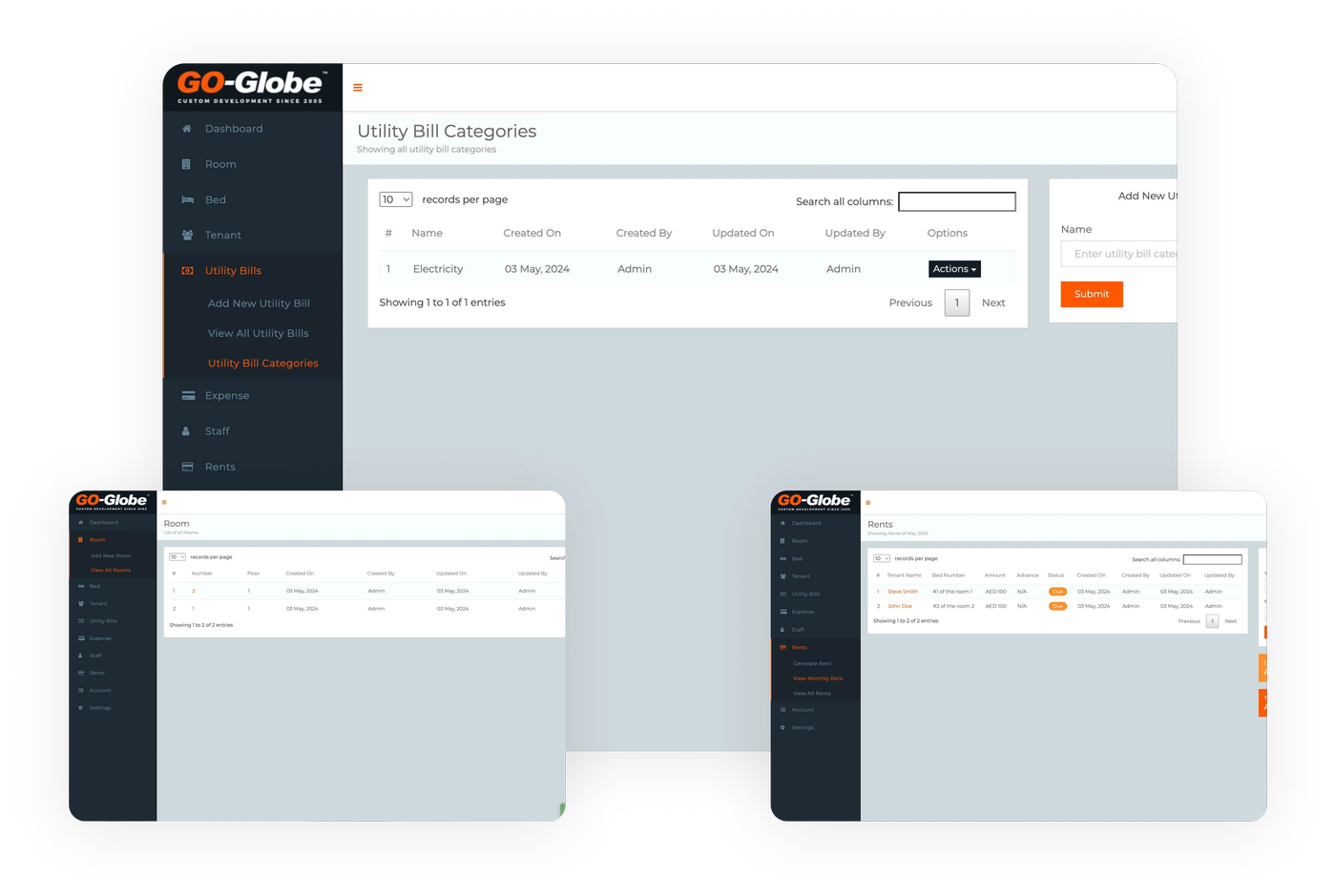 Our Tenant Management System manages tenants with modules for user management (staff & tenants), listings (rooms & beds), finances (expenses, utility bills, rent), staff & tenant details, currencies, ID types, and website settings. Admins can addview, and manage all aspects through a user-friendly interface.